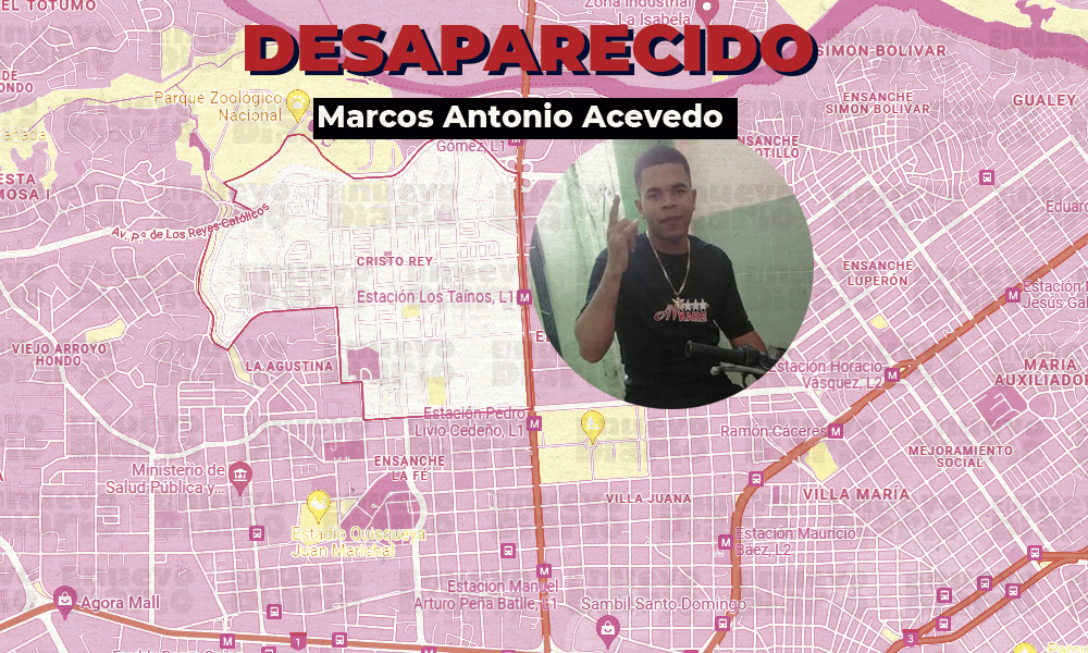 El joven identificado como Marcos Antonio Acevedo de 22 años de edad, fue visto por última vez en la avenida Máximo Gómez, esquina 38 (San Juan de la Maguana) en el sector Cristo Rey.