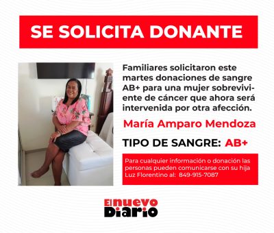 EL NUEVO DIARIO, SANTO DOMINGO.- Familiares solicitaron este martes donaciones de sangre AB+ para una mujer sobreviviente de cáncer y que ahora será intervenida por otra afección.