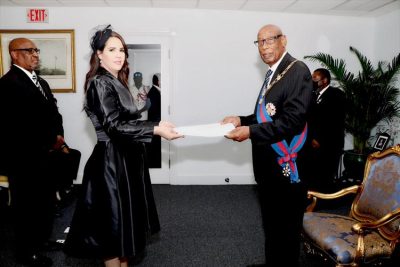 De su lado, el gobernador felicitó a la embajadora por la designación «es un placer para mí aceptar sus cartas credenciales que la designan como la primera embajadora extraordinaria y plenipotenciaria de la República Dominicana ante la mancomunidad de Las Bahamas».