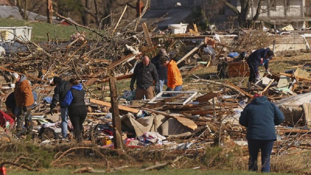 Mientras esperan la llegada de Biden, vecinos de Mayfield y los equipos de rescate continúan con las tareas de desescombro tras el tornado que destrozó cientos de casas y dejó importantes daños en edificios históricos, la comisaría de Policía, la estación de Bomberos y los juzgados.