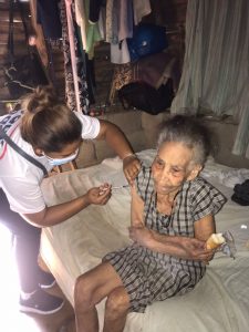 Alfa María Almánzar alcanzó a ver los vehículos del INFOTEP y al personal de Salud Pública y se acercó a ellos, le pidió acudir a su casa, estaba cerca, pedía que vacunaran a su abuelo, Pedro María Felipe, quien a sus 92 años ya se le dificulta caminar.