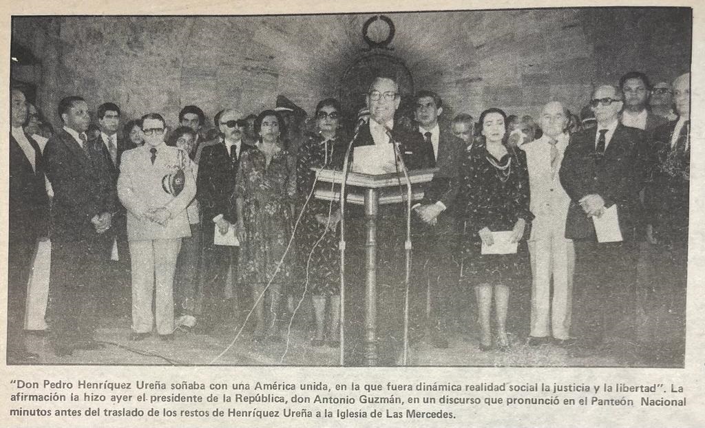 EL NUEVO DIARIO, SANTO DOMINGO. – «Don Pedro Henríquez Ureña soñaba con una América unida, en la que fuera dinámica realidad social la justicia y la libertad» La afirmación la hizo ayer el presidente de la República, don Antonio Guzmán, en un discurso que pronunció en el Panteón Nacional, minutos antes del traslado de los restos de Henríquez Ureña a la Iglesia de Las Mercedes.