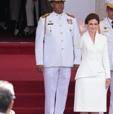 EL NUEVO DIARIO, SANTO DOMINGO.- La vicepresidenta de República Dominicana, Raquel Peña, vistió este viernes un traje confeccionado por el diseñador Luis Domínguez para asistir a los actos de investidura para el segundo período del gobierno del presidente Luis Abinader.