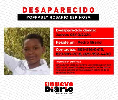Para cualquier información sobre Yofrauly se ofrecieron los números de teléfono: Elena (abuela): 809-816-0416; Radamés Rosario Rodríguez (padre): 829-787-7618 y Marlenys Espinosa (madre): 829-792-4400.
