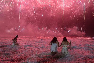 En las arenas, tomadas por una multitud en su mayoría vestida de blanco como manda la tradición, no faltaron los altares con velas y flores para Yemayá montados por los practicantes de las religiones afrobrasileñas.
