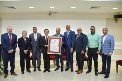 El pergamino del reconocimiento fue recibido por el embajador chino en República Dominicana, Zhang Run, luego de que el Pleno de la Cámara Alta aprobara a unanimidad una Resolución propuesta por el senador Aris Yván Lorenzo.