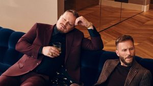 Schajris y García, que forman uno de los dúos más reconocidos de la música pop en español, especialmente por sus baladas, aparecen vestidos de negro y ambos con barba incipiente.