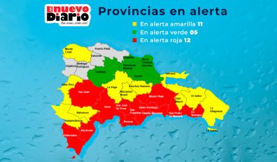 Mientras tanto, en alerta amarilla, ante posibles situaciones severas de emergencia por el incremento de las lluvias: Elías Piña, Hato Mayor, La Vega, Monseñor Nouel, La Altagracia, Duarte, El Seibo, María Trinidad Sánchez, Samaná, Sánchez Ramírez y Bahoruco.