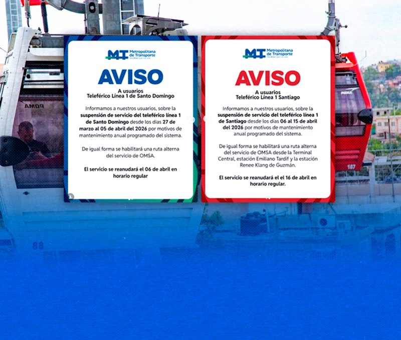 Según la entidad, la Línea 1 del Teleférico de Santo Domingo estará fuera de servicio desde el 27 de marzo hasta el 5 de abril de 2026. Durante ese período se realizarán labores técnicas de mantenimiento preventivo para garantizar la seguridad y el correcto funcionamiento del sistema de transporte por cable.