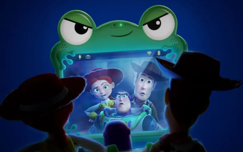 En el vídeo se puede ver como los protagonistas de la saga, Buzz y Woody, presencian en esta nueva entrega la llegada de Lillypad, una tableta inteligente con forma de rana que sienten como una amenaza.