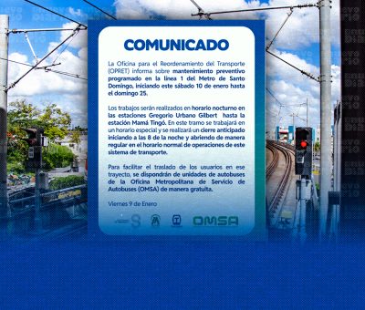 El tramo que permanecerá cerrado desde mañana sábado hasta el 25 de enero en horario de 8:00 p.m. hasta las 6:00 a.m. va desde la estación Gregorio Urbano Gilbert hasta la estación Mamá Tingó.