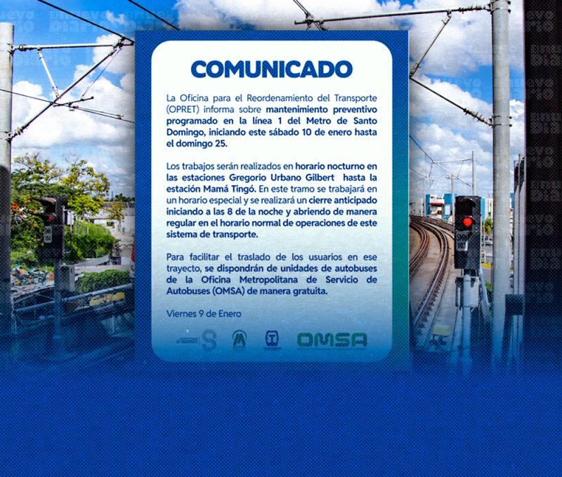 EL NUEVO DIARIO, SANTO DOMINGO.- La Oficina para el Reordenamiento del Transporte (Opret) informó este viernes que un tramo de la línea 1 del Metro de Santo Domingo estará cerrada por 16 días por un mantenimiento programado.
