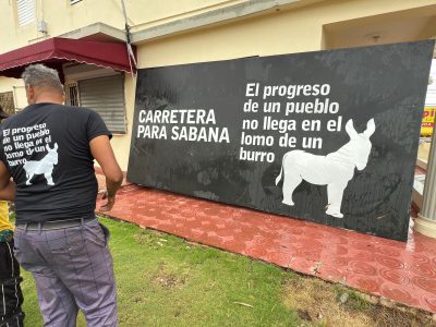 La valla de gran tamaño expresa: «El progreso de un pueblo no llega en el lomo de un burro. Carreteras para Sabana», y hace referencia a los tramos Sabana, Taraná, Autovía del nordeste y Sabana, Barey, Enriquillo, cuya reconstrucción fue anunciada con un primer picazo por el presidente Luis Abinader el 6 de mayo de 2022, sin que hasta la fecha se haya completado.