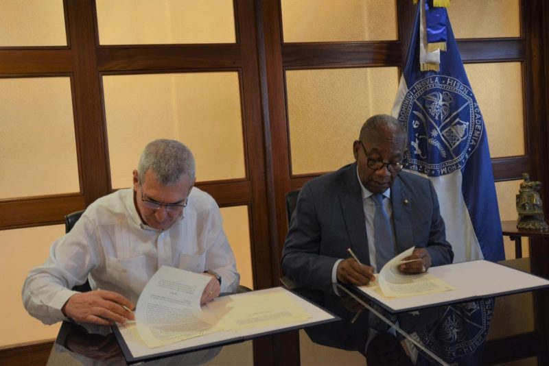 La firma del documento se realizó en el despacho de la rectoría en el noveno piso de la Torre Administrativa de la academia, rubricado por el rector Editrudis Beltrán y Gabriel Roca Mir, vicepresidente ejecutivo del Grupo Martinón.