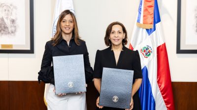 La doctora Odile Camilo Vincent, rectora de Unibe, y Mildred Minaya, vicepresidenta de Comunicación, Sostenibilidad y Reputación de APAP, sellaron este acuerdo que refuerza el compromiso de ambas instituciones con el desarrollo social y económico del país a través de una educación de calidad.