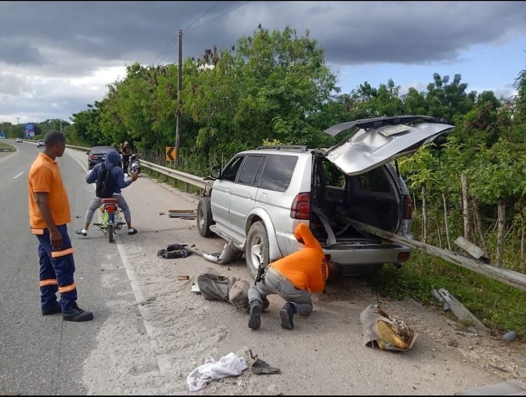 EL NUEVO DIARIO, SAN PEDRO DE MACORÍS.-Un vehículo quedó incrustado en las barandas de seguridad de la Autovía del Este en un hecho registrado en la tarde del lunes después del puente del Río Soco en dirección La Romana- San Pedro de Macorís.