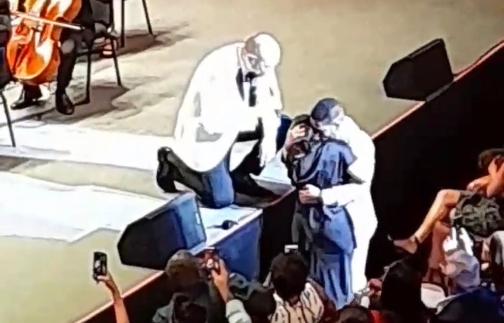 Santiago Cruz estaba interpretando junto a la Orquesta Sinfónica Nacional “Y si te quedas, ¿qué?”, al momento de la entrega del anillo y al finalizar felicitó a la pareja.