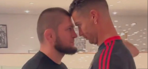 EL NUEVO DIARIO, SANTO DOMINGO.- El estelar jugador del Manchester United, Cristiano Ronaldo, se enfrascó en una inusual pelea con Khabib Nurmagomédov, un luchador de artes marciales mixtas, la cual se ha vuelto viral en redes sociales debido a que la misma resultó ser un momento jocoso por ser una “guerra de miradas”.