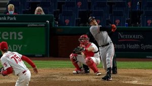 El dominicano empezó el castigo contra la novena de Filadelfia en el primer episodio al encontrar la serpentina del abridor Zach Eflin, sin corredores por delante.